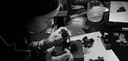 USING BOTH TRADITIONAL TECHNIQUES AND NEW TECHNOLOGIES, HER PIECES ARE DELICATE AND REFINE. SHE EXPLORES THE RELATIONSHIP BETWEEN MAKER, JEWELLERY AND WEARERS IN ORDER TO ENCOURAGE THE WEARER TO ENGAGE MORE WITH THE PIECE APART FROM WEARING THEM. THE PUBLIC PERCEPTION OR REACTION TO THE JEWELLERY WHEN PRESENTED TO THEM IN DIFFERENT STATES OF EXISTENCE AND BRINGS NEW EXPERIENCE TO WEARERS OR VIEWERS, AND A NEW LEVEL OF JEWELLERY WEARING.